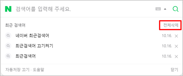 • 빈 네이버 검색창에 커서를 두고 오른쪽 아래에 전체삭제를 누르면 최근 검색된 모든 검색어를 삭제할 수 있어요.