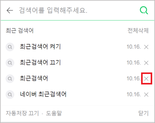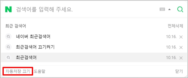 • 최근검색어 목록 아래의 자동저장 끄기 버튼을 사용해 최근검색어 기능을 끌 수 있어요.